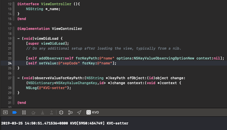 在这里我要说一下我对于kvc是kvo实现的基础的理解。因为在网上看到一位文章写的还不错的作者,他讲到二者实现机制不同,并无必然联系,只是KVC对KVO的支持比较好。我非常不同意这个观点。在官方键值观察编程指南中明确指出,该类的属性必须遵守KVC合规性。KVC是一个通过字符串访问对象属性的协议,包括搜索模式也属于该协议的一部分。KVO观察的属性,必须遵守KVC合规性,并且支持观察KVC兼容的所有访问器修改属性。通常我们所理解的KVO都是基于setter访问器实现的,然而并非如此。下图也充分验证KVO支持KVC的搜索模式: