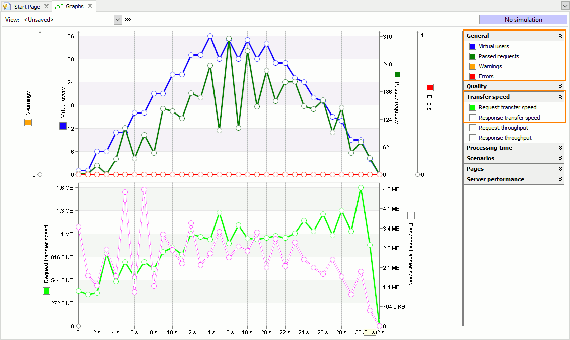 在测试运行期间,打开Runtime> Graphs页面。在基本质量指标将帮助您确定服务器是否能够与预期负载应付。而传输速度的指标将显示服务器响应时间是否保持在可接受的: