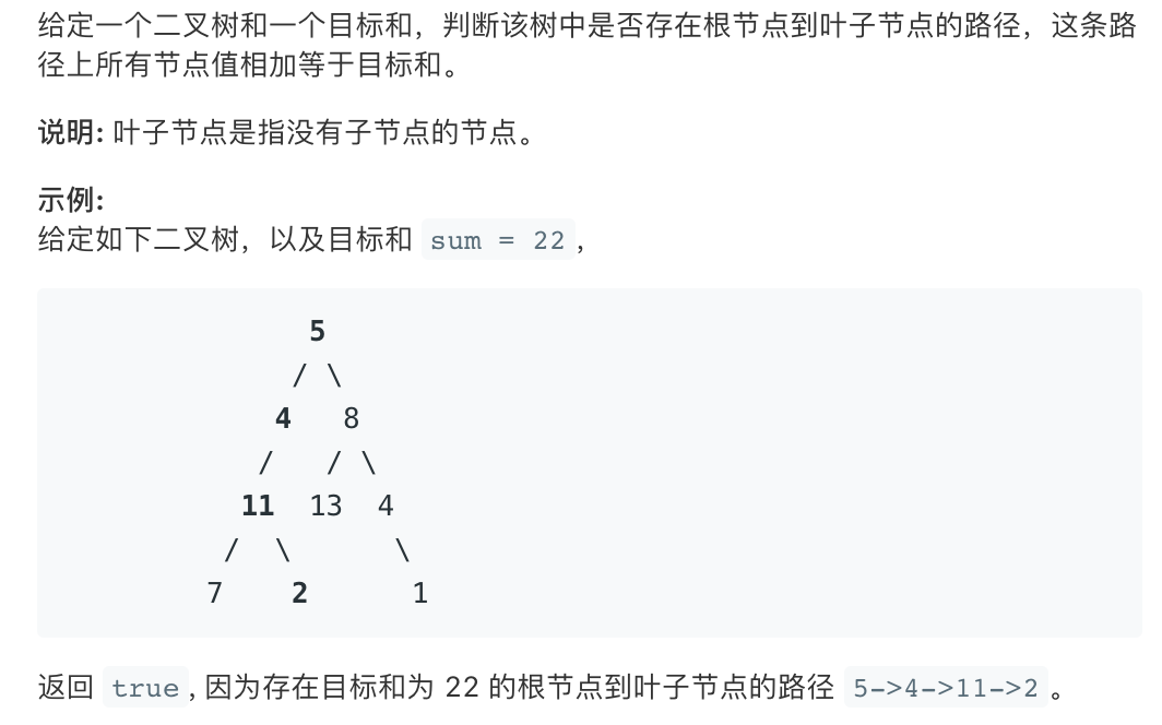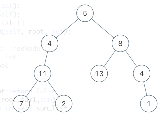 做这道题首先想到的,就是遍历这棵树的所有根结点到叶结点的路径,将每条路径的和保存在一个list中,最后看list中是否含有题目给定的数据即可。遍历一棵树的所有路径,一定是要用到深度优先,写递归函数的,那么还是抓住一个点去看,就拿5这个结点来看,当递归函数输入的结点是5。