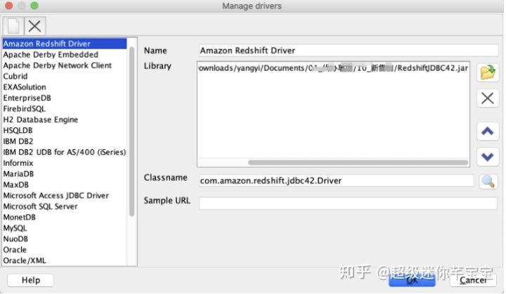 - 在SQL Workbench/J中新建Drivers,选择下载的驱动程序jar,并填写Classname为 com.amazon.redshift.jdbc42.Driver。