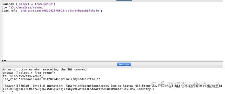 在卸载数据到S3之前一定要确保IAM权足够,否则如果您在运行 COPY、UNLOAD 或 CREATE LIBRARY 命令时收到错误消息 S3ServiceException: Access Denied,则您的集群对于 Amazon S3 没有适当的访问权限。如下: