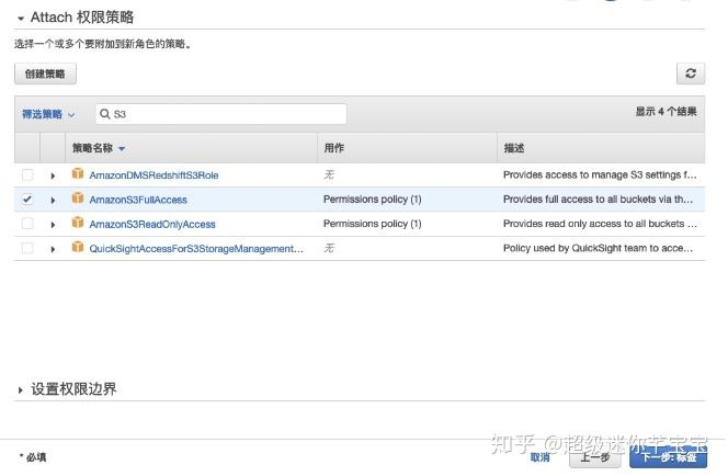step3:搜索策略S3,找到AmazonS3FullAccess,点击下一步。