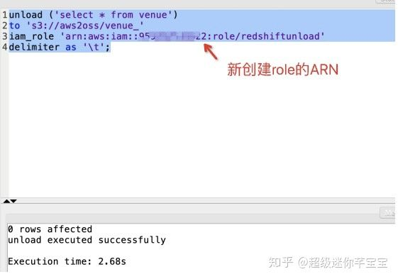 iam_role '<新建的redshiftunload角色对应的ARN>';