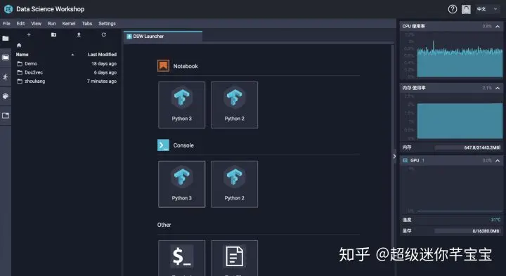 现在基础环境以及搞定了,我们可以用terminal安装自己需要的包环境。同时可以选择python2或者python3的开发环境。而且左侧的文件系统,支持本地文件的上传下载等。