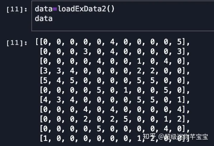 横轴为美食品种,分为A--K 11中,竖轴为用户序号,有0-9 10个人。表内值为某个用户对某种美食的推荐分,0表示其未曾吃过,5分为最高的推荐分。以上数据为实验虚构数据。