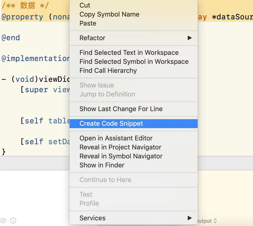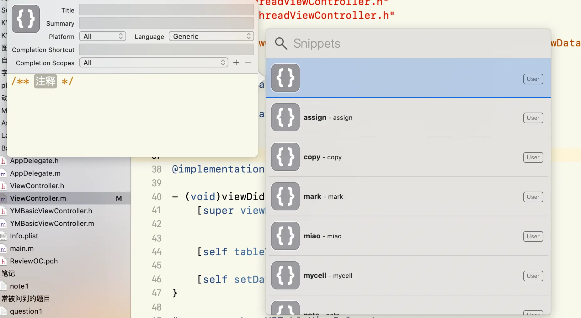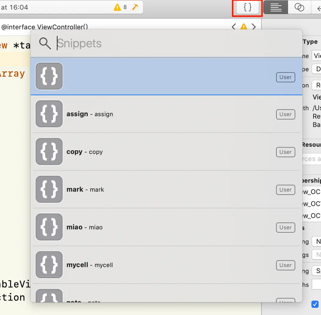 xcode10 自定义代码块 余默 2019-03-26 1,167 阅读1分钟 xcode10 之后自定义代码块已经不是10之前,直接将代码拖拽到代码块列表进行编辑了,10之后自定义代码块的方法,选择代码右键Create Code Snippet在这里查看代码块然后选中想要自定义的代码块,光标放在图标上,就会出现个编辑页面 ,标点符号都要是英文/** <#注释#> */ @property (nonatomic, strong) <#class#> *<#name#>;