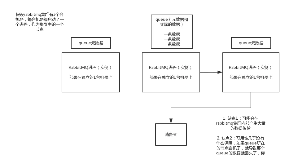 在多台机器上启动多个RabbitMQ实例,每个机器启动一个。但是你创建的queue只会放在一个rabbitMQ实例上,但是每个实例都同步queue的元数据。完了你消费的时候,实际上如果连接到了另外一个实例,那么那个实例会从queue所在实例上拉去数据过来。这种方式确实很麻烦,也不怎么好,没做到所谓的分布式,就是普通集群。因为这导致你要么消费者每次随机连接一个实例然后拉取数据,要么固定连接那个queue所在实例消费数据,前者有数据拉取的开销,后者导致单实例性能瓶颈。