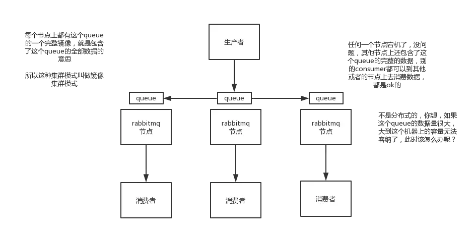 而且如果那个放queue的实例宕机了,会导致接下来其他实例就无法从那个实例拉取,如果你开启了消息持久化,让rabbitMQ落地存储消息的话,消息不一定会丢失,得等这个实例恢复了,然后才可以继续从这个queue拉取数据。所以这个情况就比较尴尬,没有什么所谓的高可用性可言,这个方案主要是提高吞吐量,就是说让集群中多个节点来服务某个queue的读写操作。