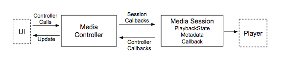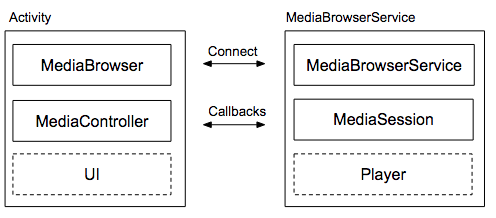 客户端需要创建MediaBrowser,服务端需要实现MediaBrowserService,在建立连接后,两端之间的交互主要通过MediaController和MediaSession。两个类之间通过预先定义的callback进行交互,MediaSession控制着播放器的播放,MediaController来控制着UI的变化。