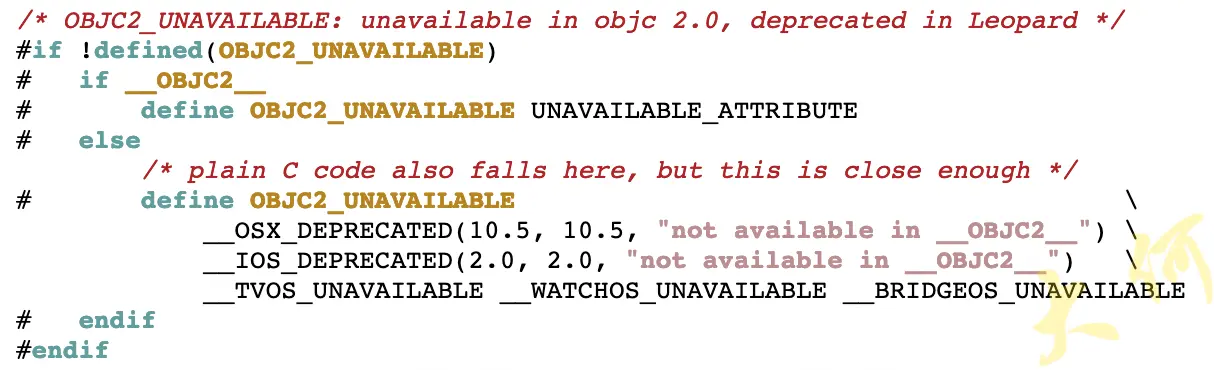 OBJC2_UNAVAILABLE 在objc 2.0中不可用,在Leopard中弃用(不建议使用,但是还可以用)。Leopard是2006年WWDC公开的Mac OS 系统版本。