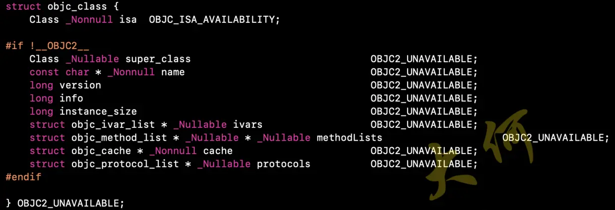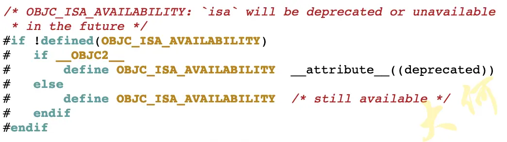 判断OBJC_ISA_AVAILABILITY这个宏是否被定义过, 如果没有定义过, 就执行执行随后的语句。 我们搜索开源的文件,没有查到它在其他地方定义,所以这里就算是它的定义了。