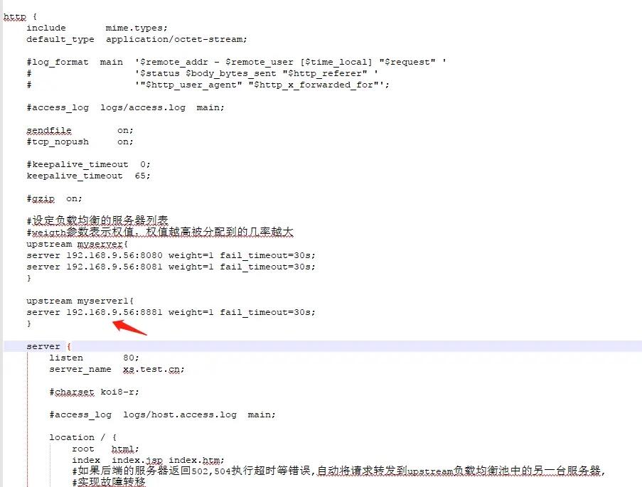 我们可以打开的nginx.conf文件,找到Http下的server模块,在上方添加我们的Upstream模块。如下图:
