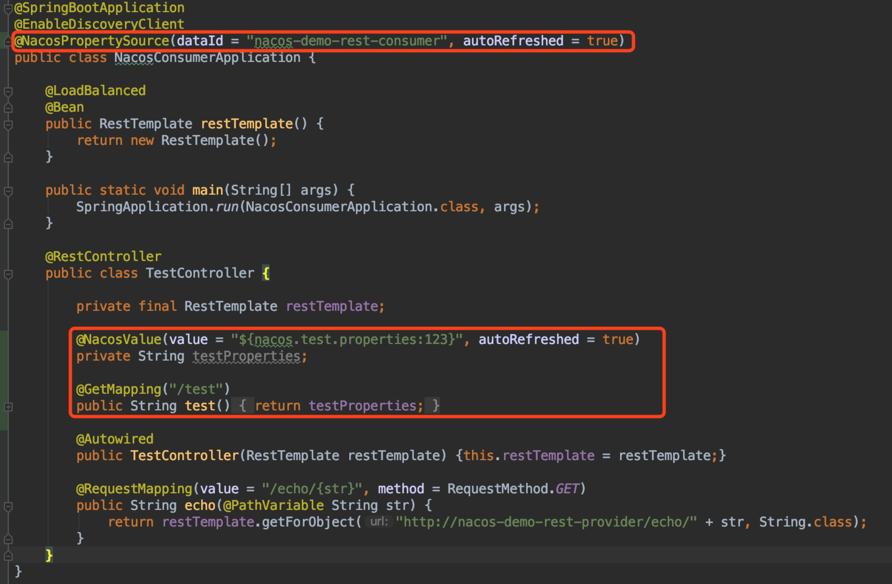 第二步,在SpringBoot启动类上加上注解@NacosPropertySource(dataId = "nacos-demo-rest-consumer", autoRefreshed = true),dataId为配置中心的配置源唯一ID,autoRefreshed设置为自动刷新配置。 再通过Nacos的 @NacosValue 注解设置属性值,其中${nacos.test.properties:123}冒号后面的值表示如果取不到配置给的一个默认值。