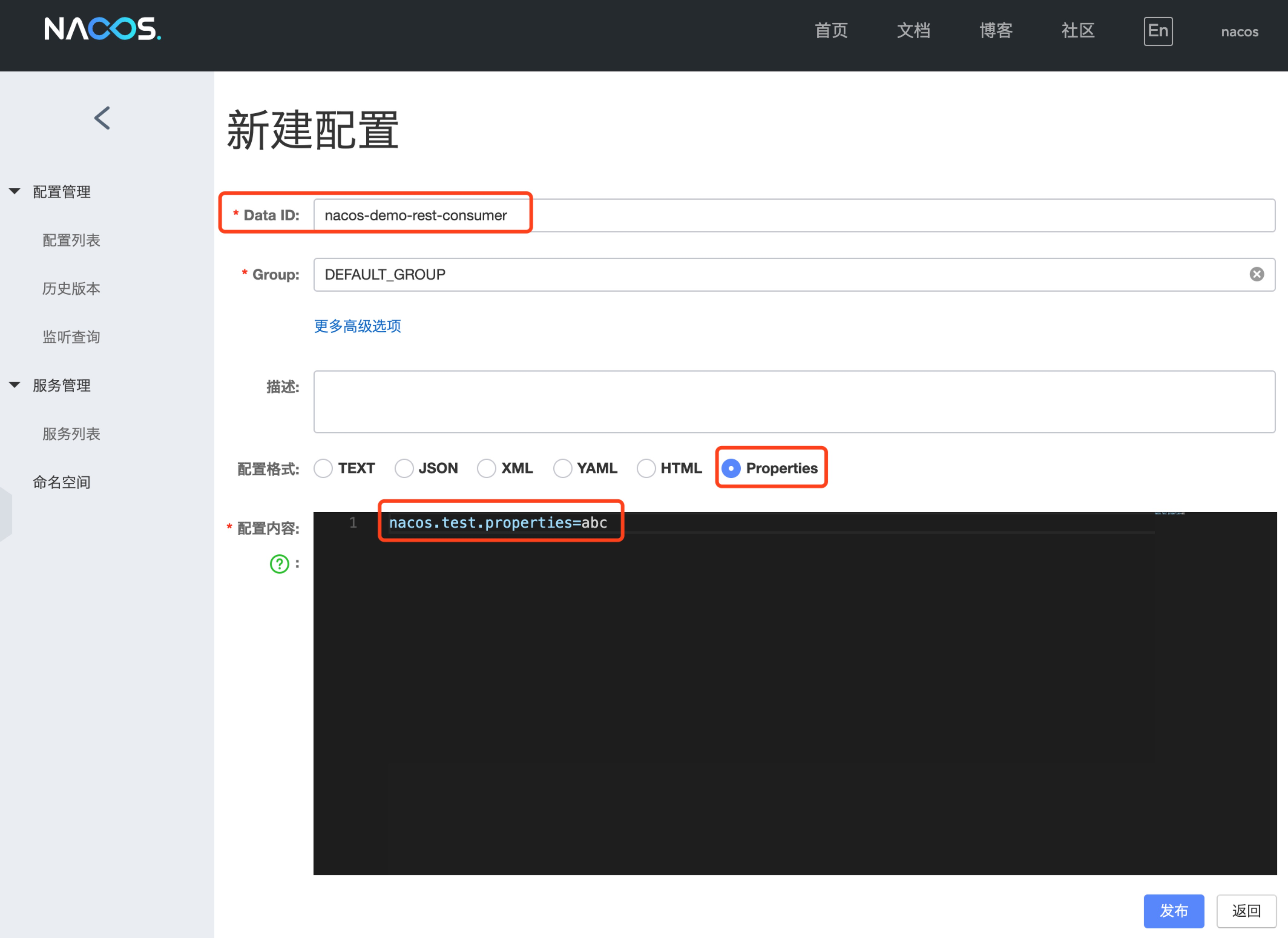 第三步,登录Nacos控制台,在配置管理-配置列表点击右侧的+号按钮,进入新建配置界面,DataId按照前面注解@NacosPropertySource的值,配置格式为properties,配置内容使用nacos.test.properties为key,如下图设置后,点击发布。