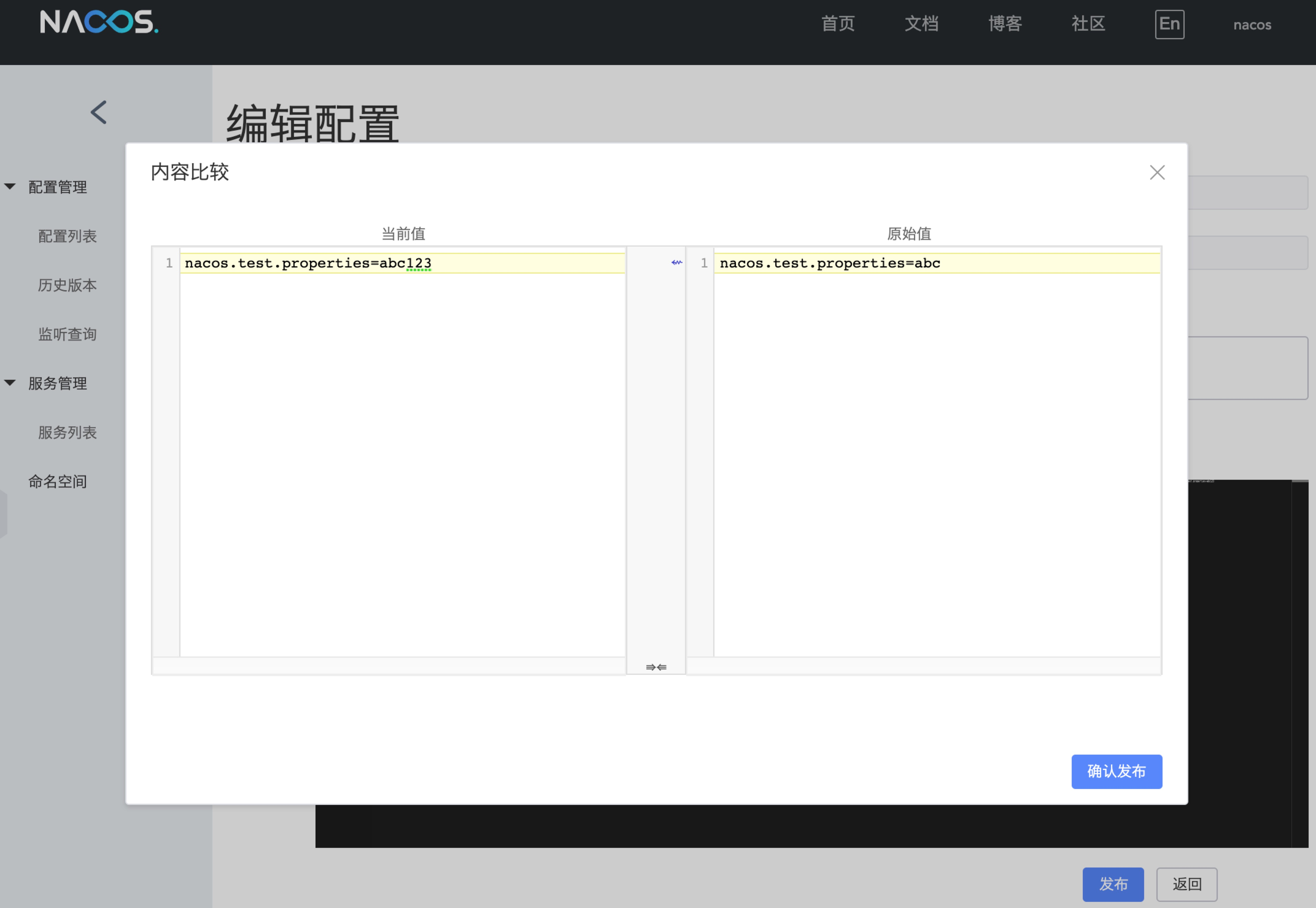 我们到Nacos控制台配置管理-配置列表对于DataId的一行右侧点击编辑进行修改配置,将配置内容改为nacos.test.properties=abc123,点击发布按钮。