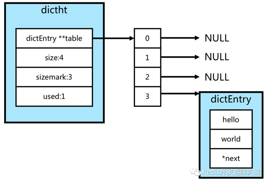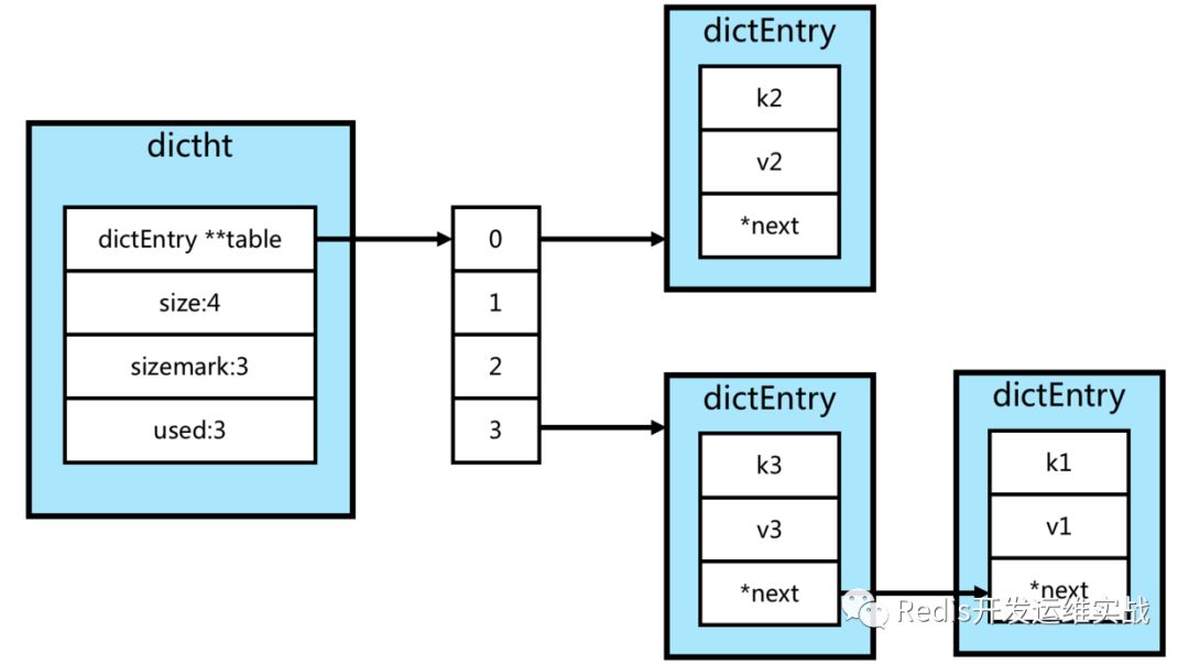 要知道能存多少,首先要知道Redis的键值对存在哪?你可能已经猜到了哈希表,它是天然的键值对数据结构,各种语言都支持该数据结构,基本上是使用数组链表的形式实现的(JDK 8用的红黑树),下面是一个整体结构。