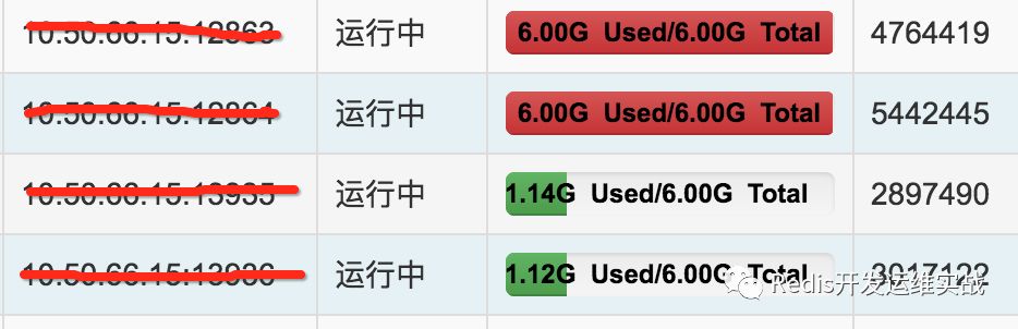 如果键值数量过多,并设置了过期时间,很可能出现类似问题。从我的实际经验来看,一旦键值个数超过千万级别,就会有这样的情况发生,下图中的下面两个节点是经过scan后的Redis实例,可以发现内存量和键值个数急剧减少。