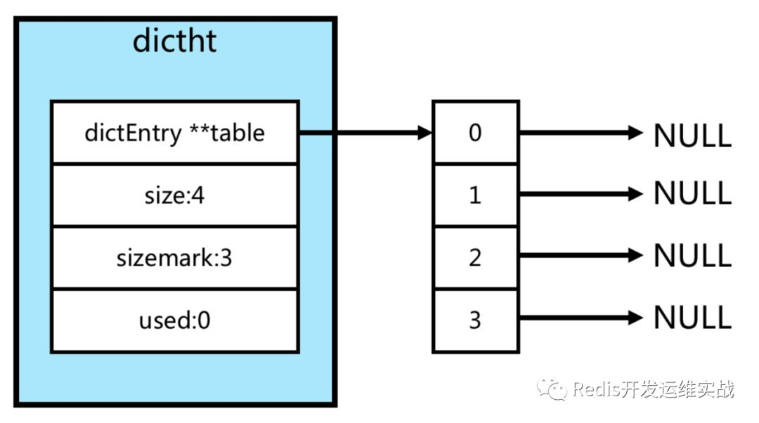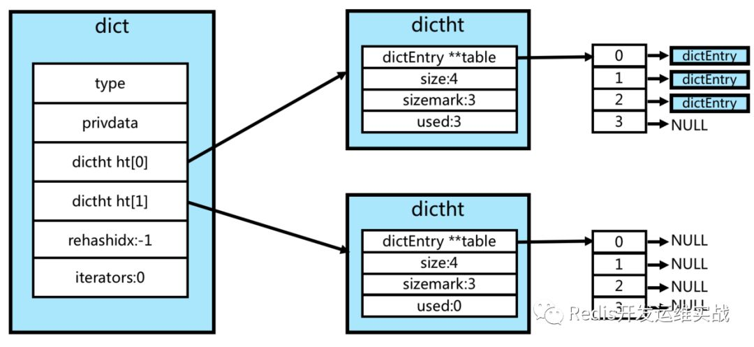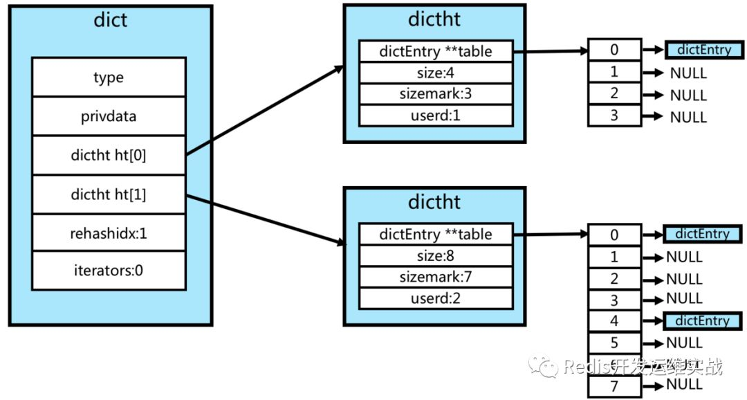 接下来问题又来了,单纯依赖链表做冲突处理,链表会越来越长,读写效率会差,所以需要对哈希表做扩容,对于Redis来说,一个哈希数据结构内置了两个哈希表(dictht),一个用于使用,另一个平时闲置,待时机成熟,扩容一倍,然后将数据迁移到另一个哈希表内,如下图所示: