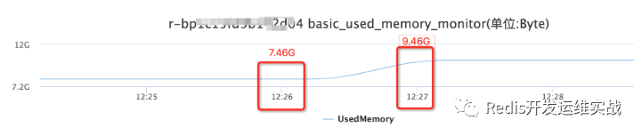 那是我在阿里云的时候,有个客户反馈他的Redis内存突然涨了2GB,如下图所示:Redis实例的内存在一分钟内突然从7.46GB涨到9.46GB,并持续了一段时间。