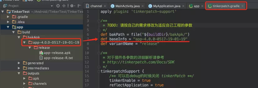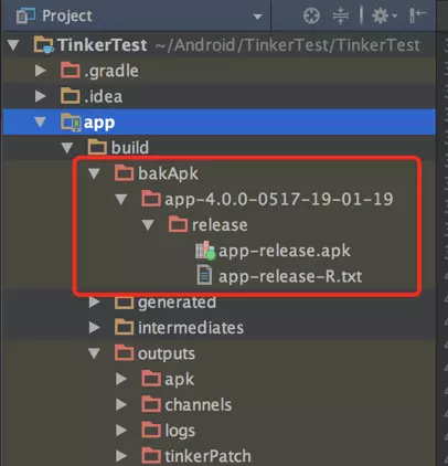 终于说到Tinker了。刚打完用来发布的渠道包,可是如果要打补丁包的话,好像还少了点什么。用来打补丁包的材料... 一个apk?还有对应的一个txt文件? 翻了下build目录,除了build/outputs/channels中有我们需要发布的渠道包,看了看bakApk...这是什么..不就是我们想要的补丁包材料!