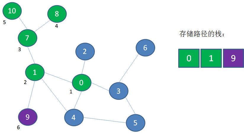 在图中,我们首先选择景点1的这条路,继续深入到景点7、景点8,终于发现走不动了(景点旁边的数字代表探索次序):