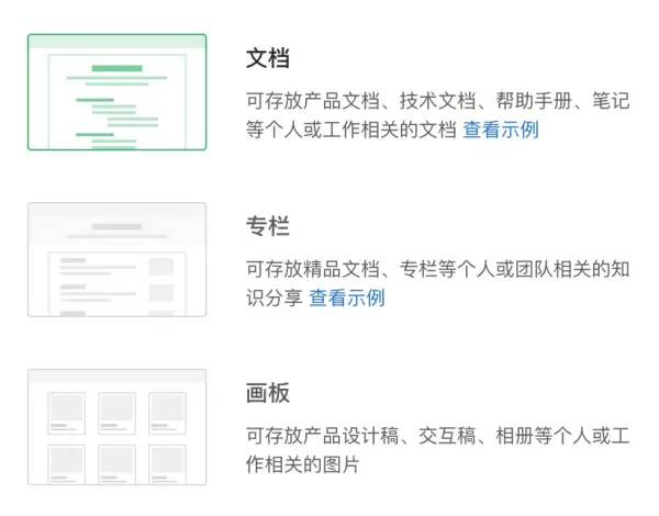 文档、专栏和画板,此外还有视频课程等很多形式的知识管理可以探索。
