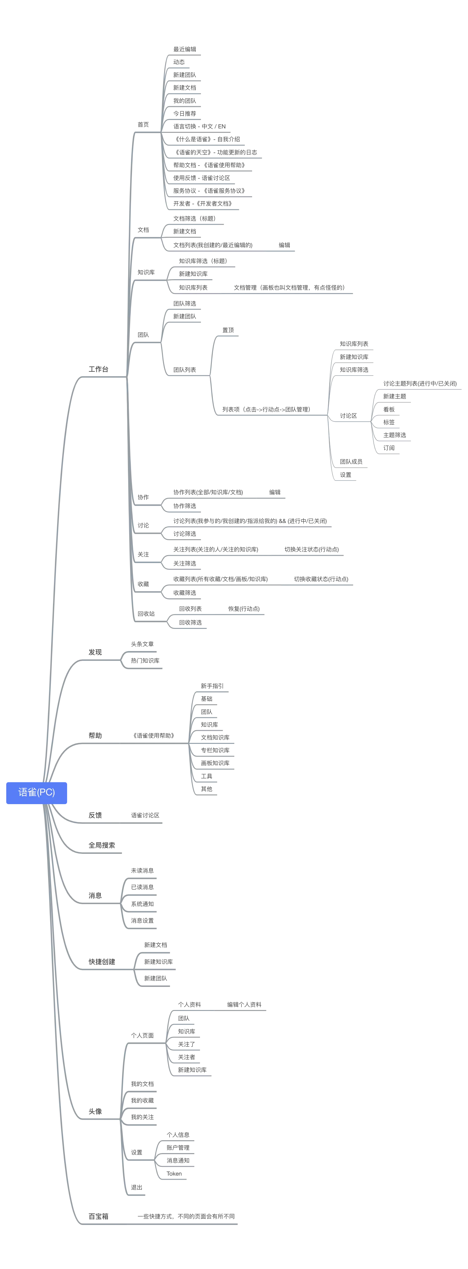 我不是企业版用户,所以基于自己可以看到的语雀toC的样子整理的产品功能图