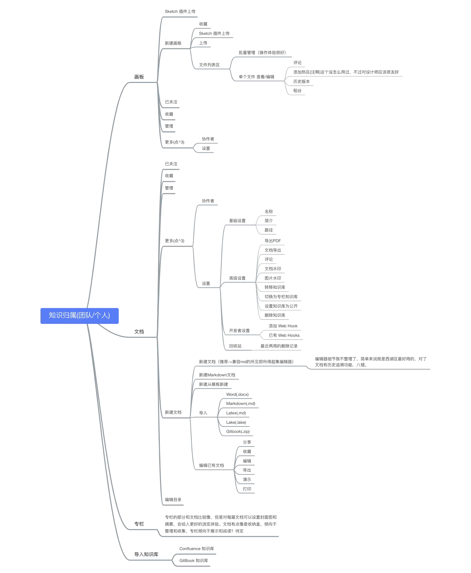 - 团队 - 知识库 - 知识实体的层次扒的功能脑图(传说企业版有空间的概念,没用过,不评论)。