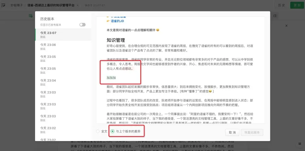 - 编辑器支持历史版本查看,细粒度比较前后版本的差别。