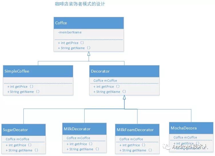 1/** 2 * @ explain: 3 * @ author:xujun on 2016/7/10 23:21 4 * @ email:gdutxiaoxu@163.com 5 */ 6public abstract class Decorator extends Coffee{ 7 8 protected Coffee mCoffee; 910 /**11 * 通过组合的方式把Coffee对象传递进来12 * @param coffee13 */14 public Decorator(Coffee coffee){15 mCoffee=coffee;16 }17}