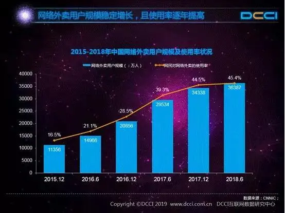 DCCI发布的网络外卖服务市场发展研究报告(2019年2月)显示,虽然网络外卖用户规模高达3.6亿,但用户规模增速有明显的放缓趋势,并且外卖使用率的增速已经不是盲目增长的阶段了,外卖市场已经进入存量阶段。