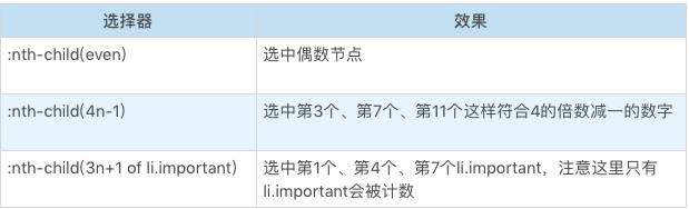 - 表格:用于处理 table 的列的伪类 + nth-col + nth-last-col