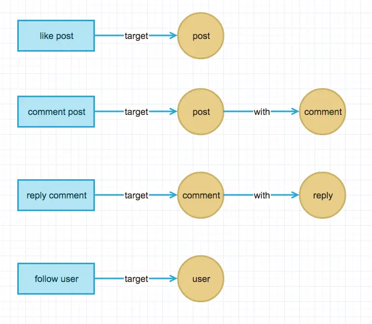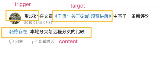 通过抽象可以得到,一条通知由三部分组成 行为的触发者 trigger 、行为主体(可能携带 内容) target 、需要通知的用户 notifiable