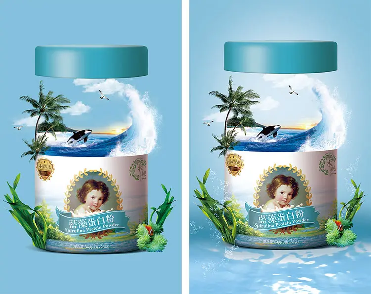 所以要提升天空与背景接触地方的亮度,加强海草的明暗对比度,并且在水草下方增加了一层水波,目的都是为了让元素与元素之间的过渡更自然。