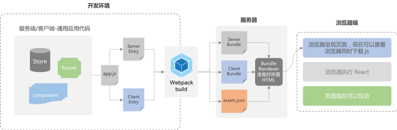 一、服务器端渲染是什么? 使用 React 构建客户端应用程序,默认情况下,可以在浏览器中输出 React 组件,进行生成 DOM 和操作 DOM。React 也可以在服务端通过 Node.js 转换成 HTML,直接在浏览器端“呈现”处理好的 HTML 字符串,这个过程可以被认为 “同构”,因为应用程序的大部分代码都可以在服务器和客户端上运行。 二、为什么使用服务器端渲染? 服务器端渲染(SSR)的优势主要在于: 更好的 SEO,由于搜索引擎爬虫抓取工具可以直接查看完全渲染的页面。 更好的用户体验,对于缓慢的网络情况或运行缓慢的设备,加载完资源浏览器直接呈现,无需等待所有的 JavaScript 都完成下载并执行,才显示服务器渲染的HTML。 三、服务端渲染方式 方式一: 传统方式服务端渲染,解决用户体验和更好的 SEO,有诸多工具使用这种方式如React的(Next.js)、Vue的(Nuxt.js)等。有些工具将 webpack 运行在服务端生产环境,实时编译,将编译结果缓存起来,这都还是传统的方式,只不过将 webpack 运行在服务端实时编译,还是开发环境编译预编译好的问题。 而这里这里将 webpack 放在开发环境,只做开发打包的功能,打包 客户端 bundle ,服务端 bundle,资源映射文件 assets.json,CSS 等资源进行部署。 服务器 bundle 用于服务器端渲染(SSR); 客户端 bundle 给浏览器加载,浏览器通过 bundle 加载更多其它模块(chunk)js; 资源映射文件 assets.json 则是,服务器 bundle 在准备所需 HTML,需要预插入那些模块(chunk)js,和CSS,这只是提高用户体验。