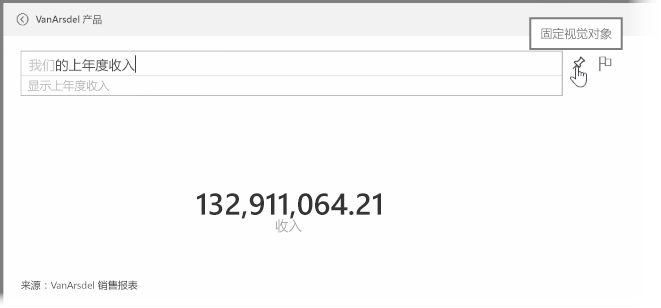 同时我们还可以使用自然语言提问,如“我们去年的收入是多少?”或者“2014年3月哪种产品销量最高?”。Power BI 将显示它对你的问题的理解,并选择最佳的视觉类型来表示答案。正如 Power BI 中的其他任何视觉对象,你可以通过选择固定图标将它固定到你选择的仪表板。