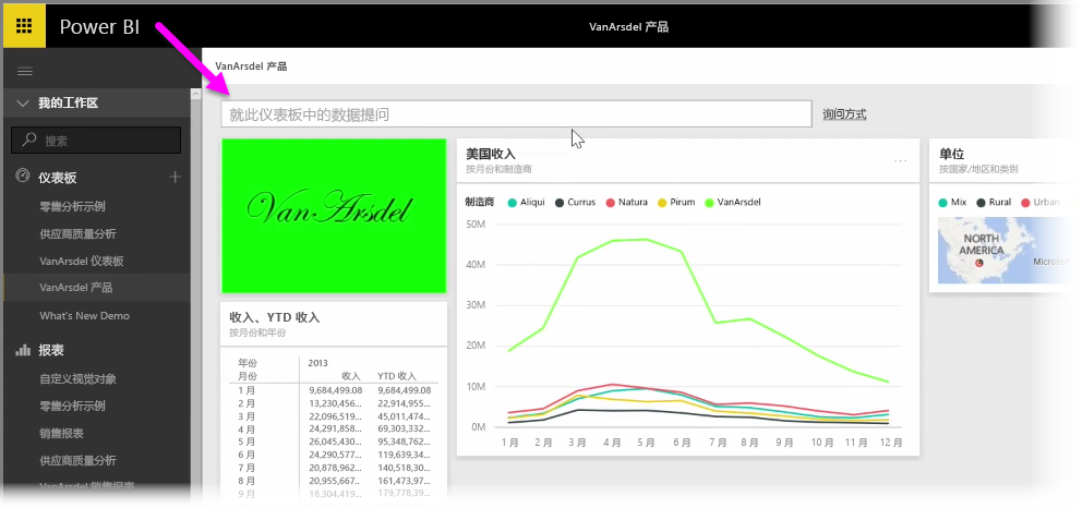 那么,要提出有关数据的问题,需要在 Power BI 中打开仪表板,屏幕顶部将显示输入框,你可以在其中提出有关所显示数据的问题。此功能有时称为“问题与解答”,更多时候简称“问答”。