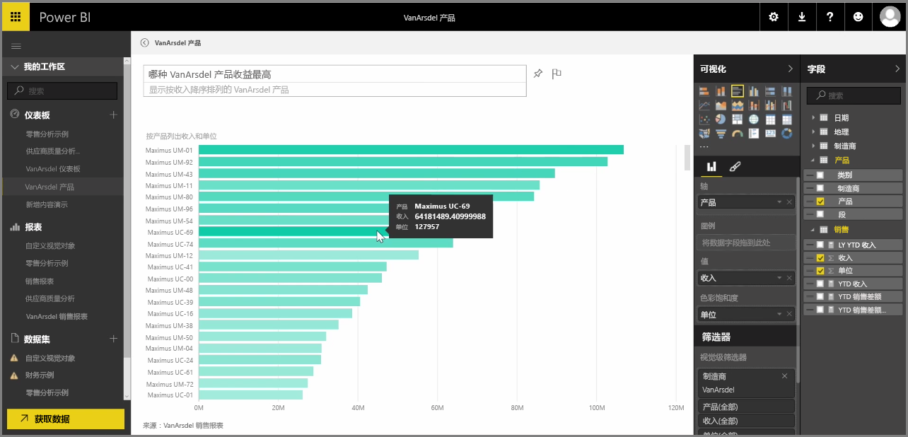 当你单击此框时,Power BI 将显示提示,其中包含以据你的数据(如“YTD收入”)为基础的建议条件。你可以单击建议条件以查看结果,结果通常显示为简单的表个或卡片。当你选择某一建议短语时,Power BI 将根据你的选择实时自动创建视觉对象。