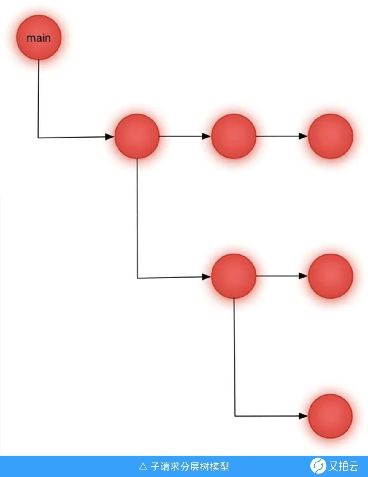 上图中,每个红圈表示一个请求,每一层的请求分别是上一层请求的子请求。从树遍历的角度讲,在这样一棵树上,哪个节点应该最先被处理?结合子请求机制的实际意义来分析,子请求是为了分摊父请求的处理逻辑,降低业务复杂度。换而言之,父请求是依赖于子请求的。很大程度上父请求可能需要等到当前子请求运行完毕后根据子请求反馈的结果来做一些收尾工作。所以需要采用的是类似后序遍历的规则。即上图最右下角的请求是第一个“活跃”的请求。