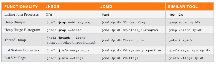 jhsdb: A New Tool for JDK 9这篇文章中列出了jhsdb与jcmd的等价命令,如下图: