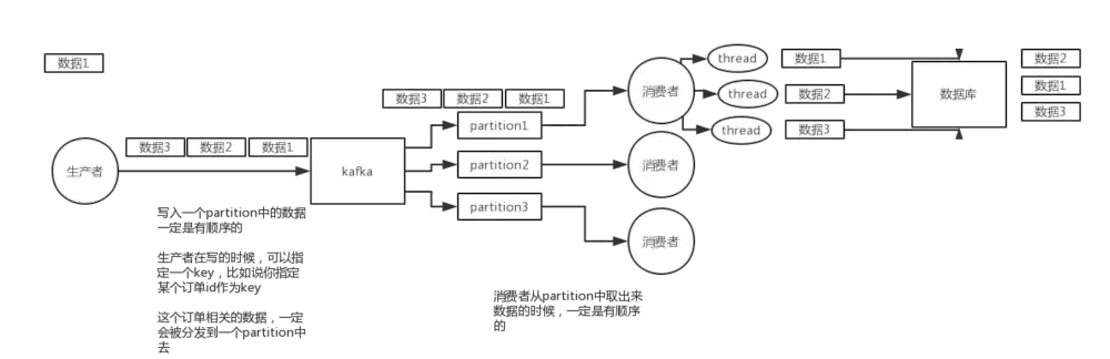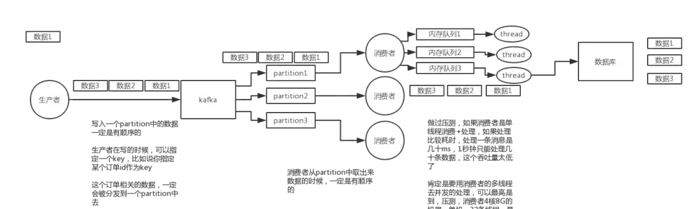 kafka 写入partion时指定一个key,列如订单id,那么消费者从partion中取出数据的时候肯定是有序的,当开启多个线程的时候可能导致数据不一致,这时候就需要内存队列,将相同的hash过的数据放在一个内存队列里,这样就能保证一条线程对应一个内存队列的数据写入数据库的时候顺序性的,从而可以开启多条线程对应多个内存队列