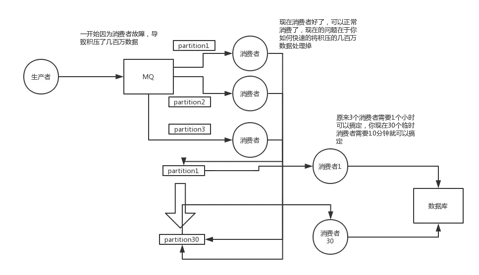 这个是我们真实遇到过的一个场景,确实是线上故障了,这个时候要不然就是修复consumer的问题,让他恢复消费速度,然后傻傻的等待几个小时消费完毕。这个肯定不能在面试的时候说吧。