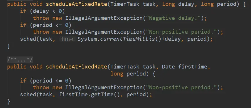 tips:周期任务重置时间时,有两种时间,当period<0时currentTime - task.period ,当period>0时executionTime + task.period。根据Timer中sched()和scheduleAtFixedRate()的区别能推断出,前者代码表示,当前任务执行完之后,再进入period时间。后这代码表示,当前任务执行开始的时,就进入period时间。