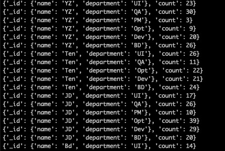 {'$group': {'_id': {'name':'$name', 'department': '$department'}, 'count': {'$sum': '$total'}}},