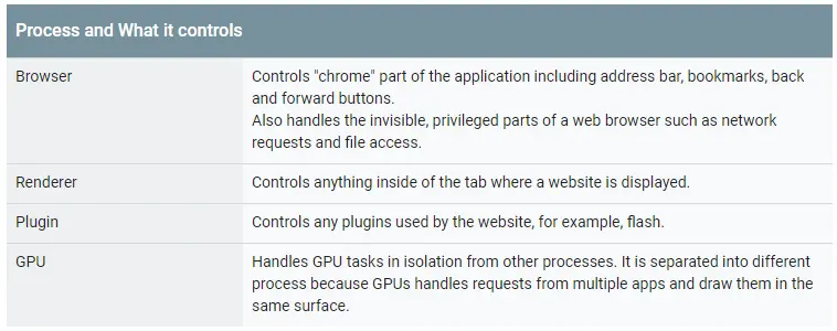 下表介绍了每个Chrome流程及其控制的内容: