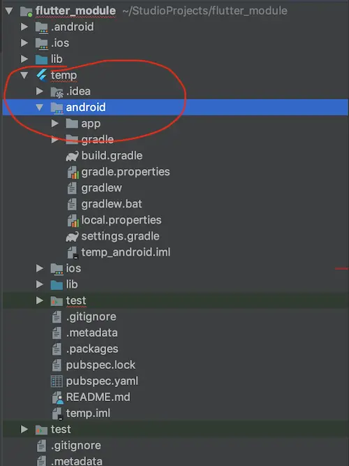 你需要做的就是把 temp 中的 android 包移动到你的 Flutter Module 工程根目录,接着删除 temp 工程包。