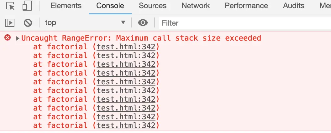console.log(factorial(6594)) // 6594爆栈输出结果我们看到,在递归近7000次的时候,堆栈溢出了(注意:这个数字毫无意义,不是w3c规范规定的,而是js的解释器定的,根据不同的平台/不同的浏览器/不同的版本可能都会不一样)。错误结果如下图所示,之所以浏览器会如此蛮横加个溢出,强制终止掉你的递归,是为了包含你的系统因为不当的程序而被耗尽内存。