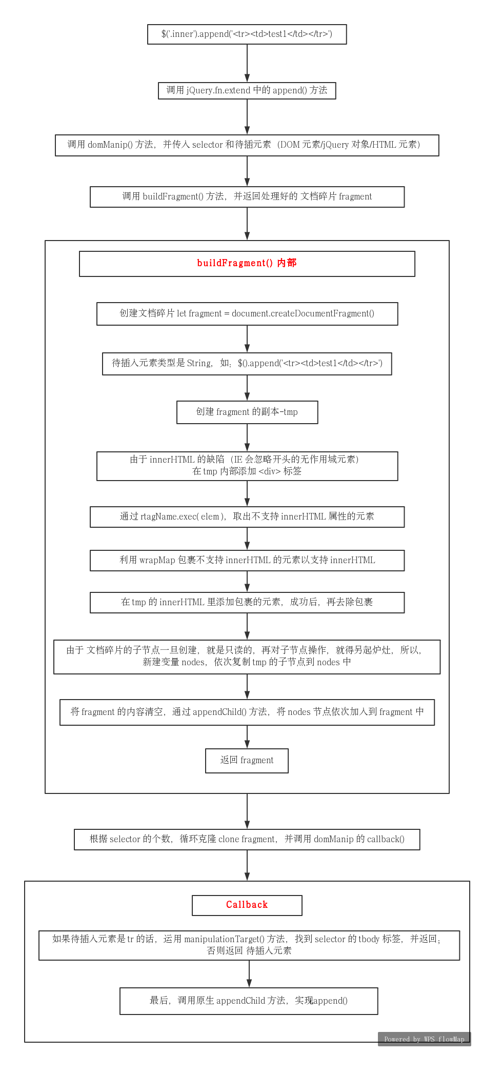 13、综上,当我调用了$('.inner').append('<tr><td>test1</td></tr>')后,jQuery内部发生的事件如下