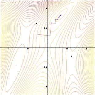 这幅图表示的是对一个目标函数寻找最优解的过程,图中锯齿状的路线就是寻优路线在二维平面上的投影。从这幅图我们可以看到,锯齿一开始比较大(跨越的距离比较大),后来越来越小;这就像一个人走路迈的步子,一开始大,后来步子越迈越小。