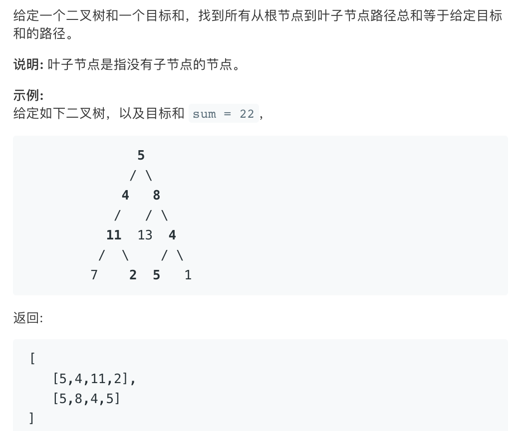 可以对比参考我的上一篇每日一道算法题--leetcode 112--路径总和--python,整体思路与上一篇基本相似,不同之处在于要保存好路径在一个list中,在判断该路径是我们要找的路径时,把这个路径list加入到返回结果list中即可。 这里有一点需要注意,对于递归过程,如果递归函数参数是局部变量,比如下面的sum1变量,则在每次递归结束时不需要还原参数,恢复现场。但是如果递归函数的参数是全局变量或者是地址传参,比如下面的list_temp,那么就需要在每次递归结束的时候恢复现场。